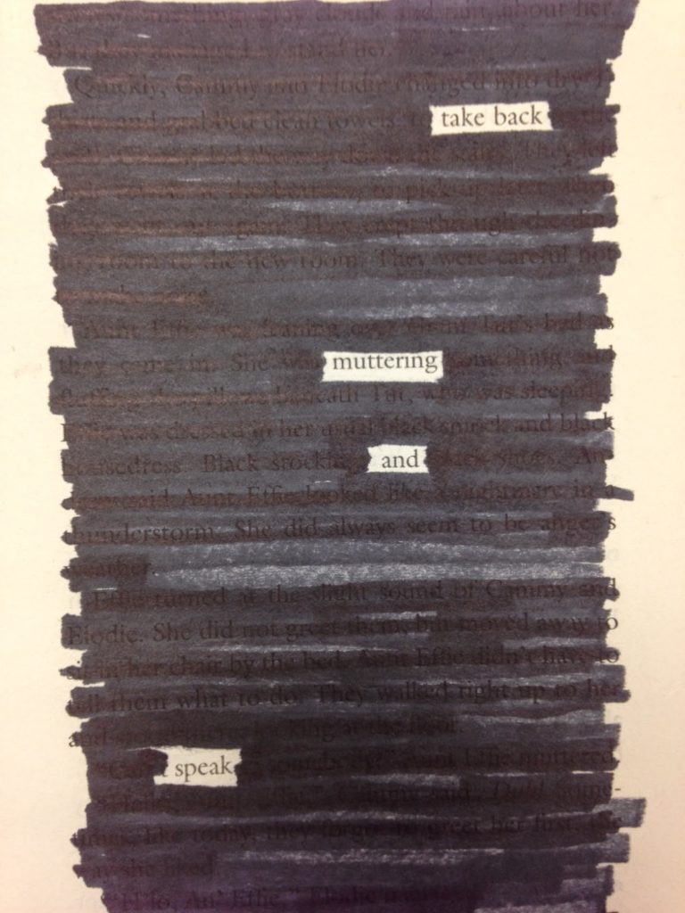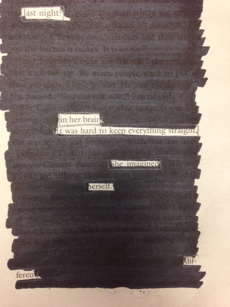 We had some leftover time on Thursday, and earlier in the week I had discovered some class library books that had been ruined in my move across campus this summer. Some had been torn in half, others had a huge chunk of the middle missing. Obviously, I couldn’t throw them away (that’s breaking one of the 10 Commandments of Reading), so I decided to tear out all the pages and assign my students some blackout poetry.